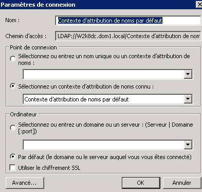 Depuis la console Adsi.mmc ouvrez le contexte par défaut du domaine. Par exemple pour « dom1.local » : DC=dom1,DC=local