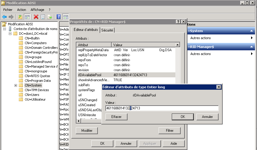 Rechercher le conteneur « system » et l’objet « RID Manager$ » et modifier l’attribut « rIDAvailablePool » en l’incrémentant de 100000.
