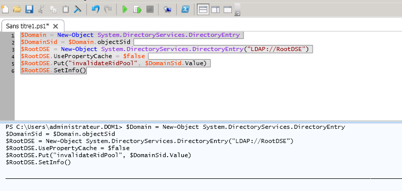 $RootDSE.Put("invalidateRidPool", $DomainSid.Value)